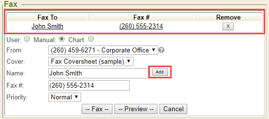 Manual: The Manual mode is used when faxing to an outside resource, or individual/location, that does not already exist in the Enterprise Health system. Manual mode can be used anytime, to fax anyone. Simply type in the Name of the outside resource being faxed. To fax the same document(s) to multiple individuals or locations, finish typing in the Fax # with area code, and click the Add button. This will populate the first recipient at the top of the section and allow additional recipients to be added, as needed. To remove a recipient, simply click the X button.