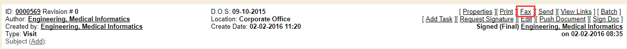 To open a Fax Dialogue window and fax a document, simply click Fax when in the specific document needing sent.