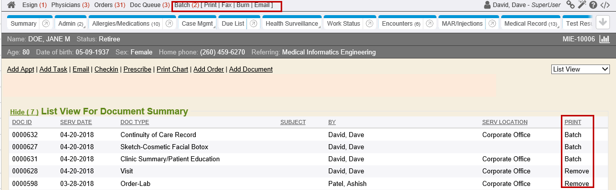 Or if several documents are being sent and a fax batch is needed, simply indicate which documents need added to the batch using the Batch links from the Documents chart tab list view. Once all documents have been batched, click the Fax link from the Batch toolbar, found at the top of the screen.