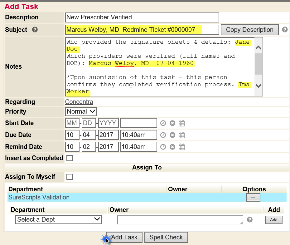 - Once the request is processed, a reply to the task will be provided, and a SureScripts Prescriber ID (SPI) will be assigned to the provider. Always check the provider prior to notifying the client.