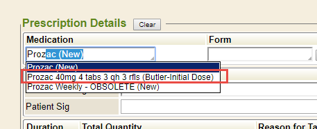 - In the Medication autocomplete field, begin typing and select the medication name. It is important not to overwrite a saved or remembered prescription. To avoid overwriting a saved prescription, use medications notated with (New). Selecting a (New) choice will prompt users to fill out each field.