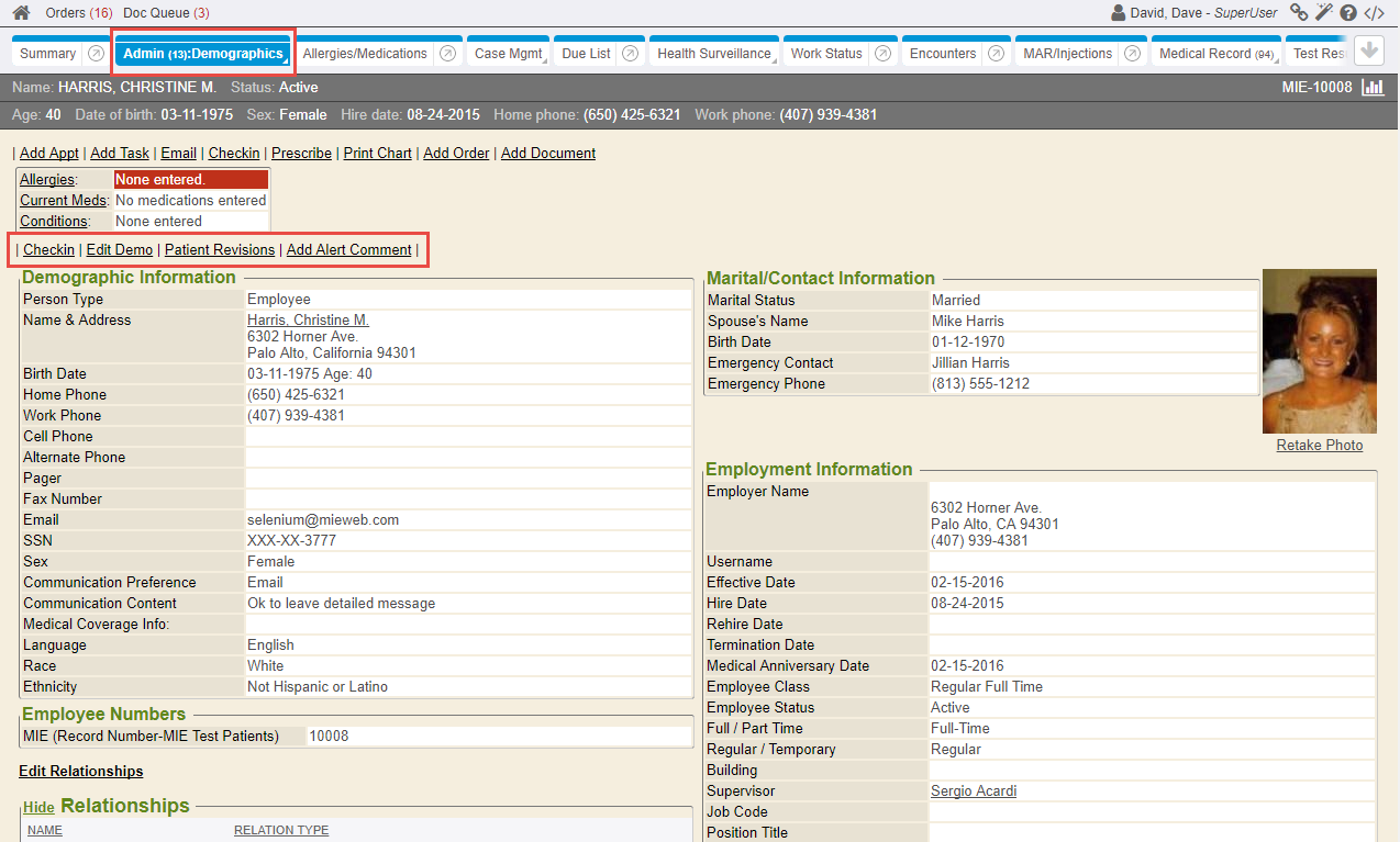 Relationships between other charts (such as EO’s, PO’s, etc) can also be established to a patient/employee chart. This is maintained in the Contacts portlet of Summary chart tab or via edit demographics screen.