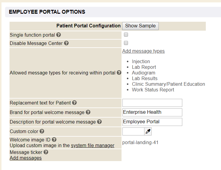 In order to access the portal as an employee, users must be established in the Enterprise Health system and have the appropriate role affiliation (i.e., an established Self role and No More Clipboard User role). To customize and configure each portal individually, users may navigate to the respective tab of the Provider Organization. For instance, the Patient Portal tab contains configuration options for the employee portal, exclusively. Under this tab, there is an Employee Portal Options section, which addresses things such as the ability to disable the message center or configure document types needed for display in the portal, or the ability to add or modify replacement text, labels, tab colors, the landing page image, or even the message ticker.