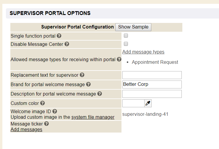 - Allowed message types for sending within portal: This field is to be used for establishing the message types allowed for transmission with the supervisor portal.