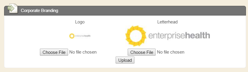 From the Corporate Branding section, clients may browse to local files of their required logo, for both document letterheads and the system/portal logo(s). Click Upload after the appropriate files have been selected, and the system will store the files and display them, accordingly.