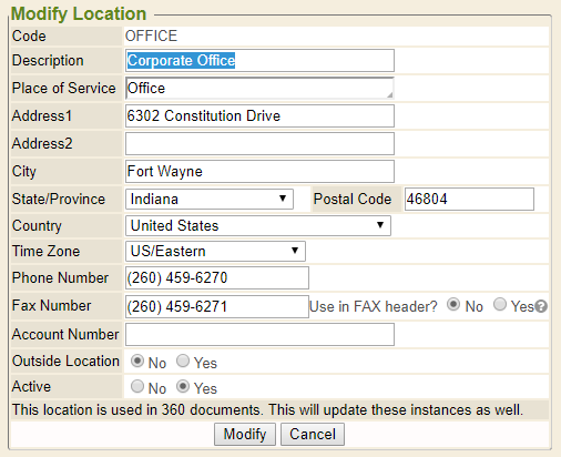 Once the primary location has been updated, additional internal or external locations may be added, as needed. To add a new location, simply click the Add Location link in the upper-right corner of the page.