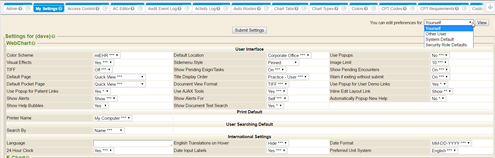 • Default Page - Select a sidemenu option as the landing page, upon login (e.g., Default to the Quick View or E-Chart page).