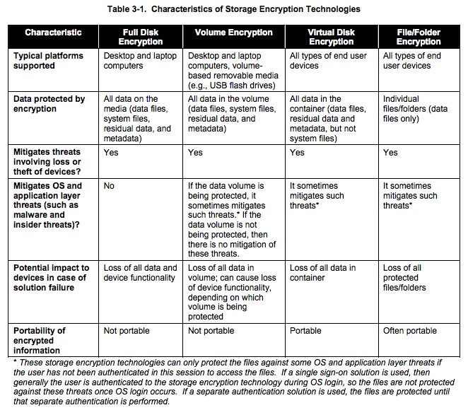 As a resource for encryption technologies that mitigate potential threats, NIST has also developed 800-111, Guide to Storage Encryption Technologies for End User Devices, where the information provided is summarized in a useful grid seen below.