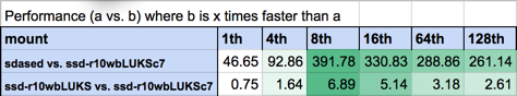 Based on benchmarking findings, it is clear that SSD is faster than a 7200 RPM hard disk with SED. At 128 threads, the SSD with LUKS AES-IN is 261 times faster.