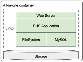 All the required services run within a single server. This approach is best utilized in small (~50 concurrent users) deployments or for sandbox development use-cases. The “all-in-one” strategy for production is best when a virtualized environment is available for scaling and redundancy underneath the Enterprise Health  System. A VM image that contains all necessary services for the Enterprise Health  System to operate can be provided. This approach can also be used for Development and QA lifecycles. The All-in-one footprint enables quick and easy deployment and can serve as a stepping stone to larger deployments with dedicated services.